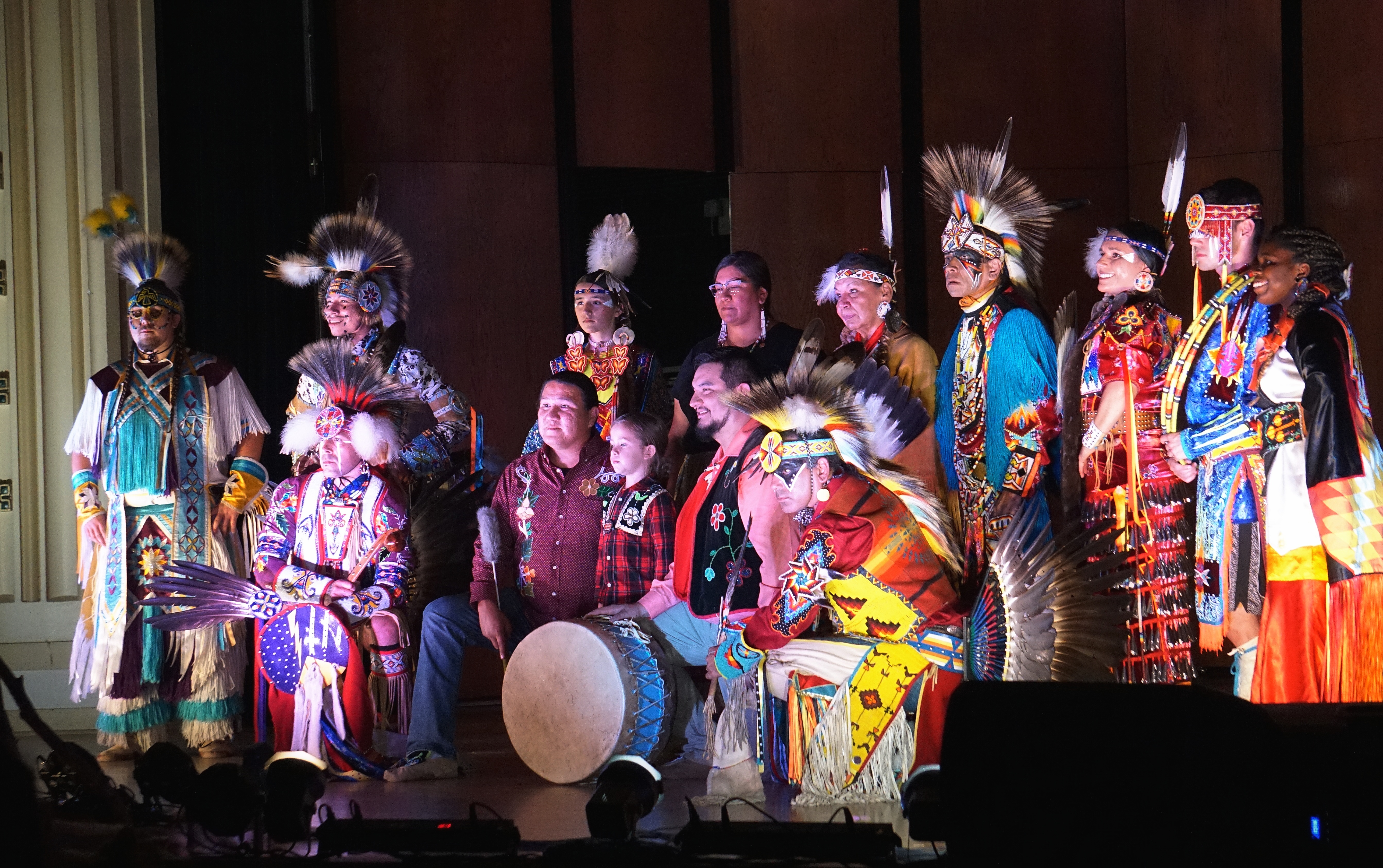 The University of Wisconsin-Superior held a celebration for Indigenous Peoples Day on Monday, October 11 at the Maawanji’idiwin – “The Place Where We Come Together” Medicine Wheel and Community Gathering Area. Two UWS students, Dillion Krisik (left) and Sami Keller (right), performed with the Chi Waagimin Bay drum group. Speaking at the event were Diversity and Inclusion Specialist Madison Hale, Dean of Students Harry Anderson, Chancellor Renee Wachter, Assistant Director – Equity, Diversity, Inclusion Salisa Hochstetler, City Council Representative Jenny Van Sickle, and Assembly District 73 Representative Nick Milroy. Following the ceremony the Woodland Sky Native American Dance Company presented a performance in Old Main’s Thorpe Langley Auditorium.