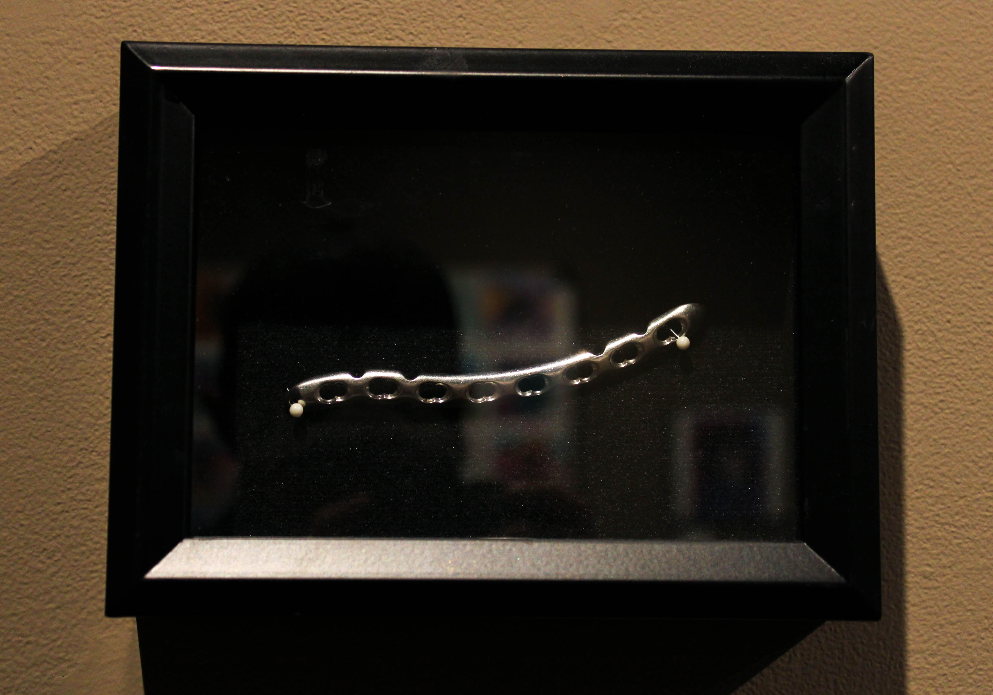 Another piece of art on display, titled “Melrose,” presents numerous empty prescription and admission wrist bands from Hamilton.